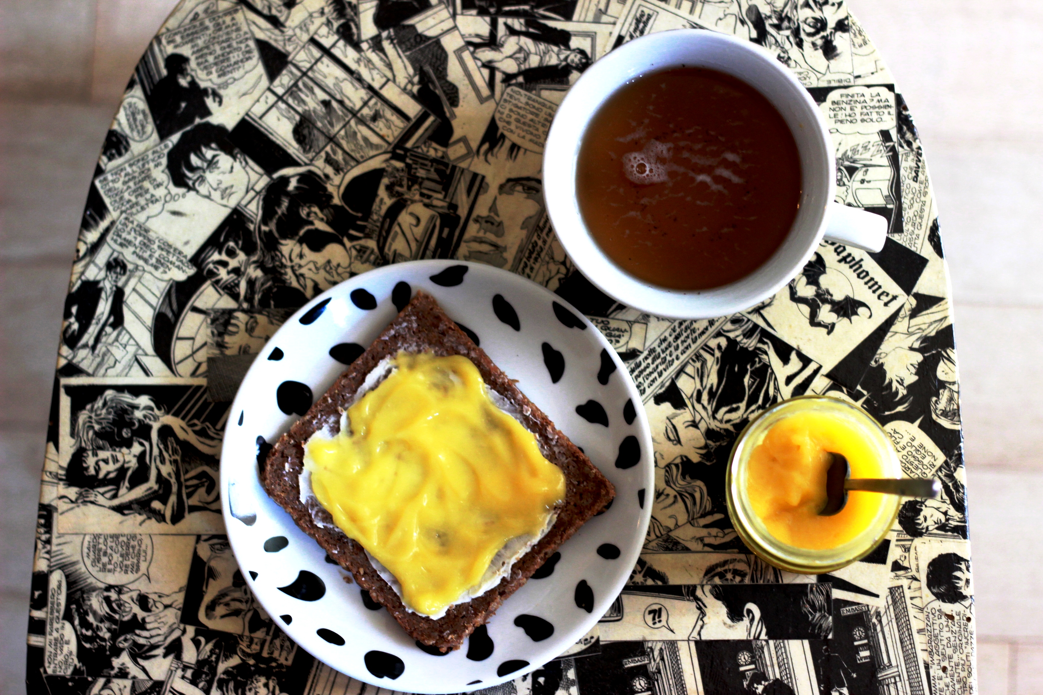 Non sapevo fosse un curd. Senza uova, è vero, ma un curd. Ne avevo sentito parlare, si, nella classica versione lemon, ma non lo avevo mai assaggiato. Ora, se neanche voi sapete cosa sia provo a spiegarvelo così: è una crema di frutta, ideata dagli Inglesi, di facile preparazione e che semplicemente crea dipendenza. Dopo aver, diciamo, indugiato alquanto nell’assaggio al cucchiaino ne ho usato un po’ per farcire una tortina margherita, che è durata un quarto d’ora: si noti anche lo squaletto sul fondo 🙂