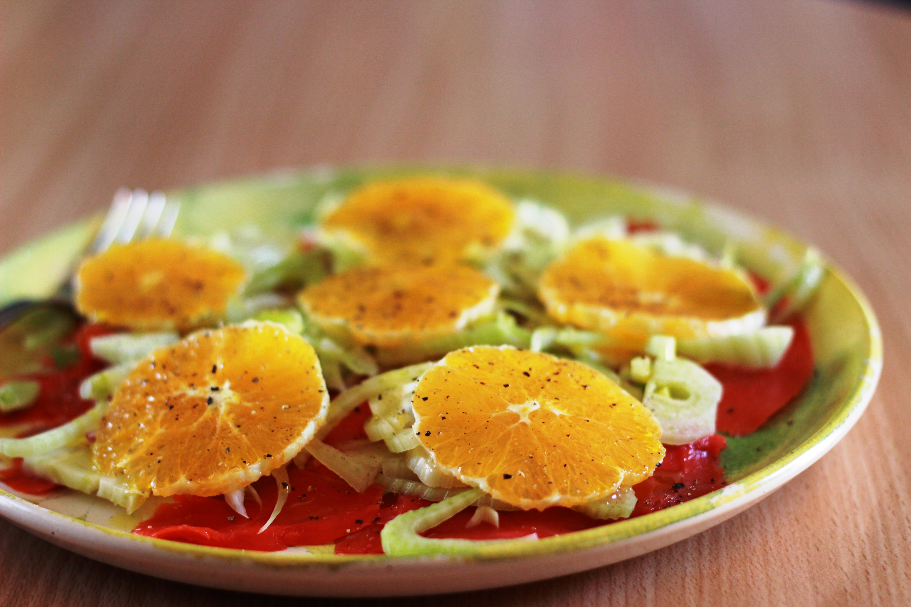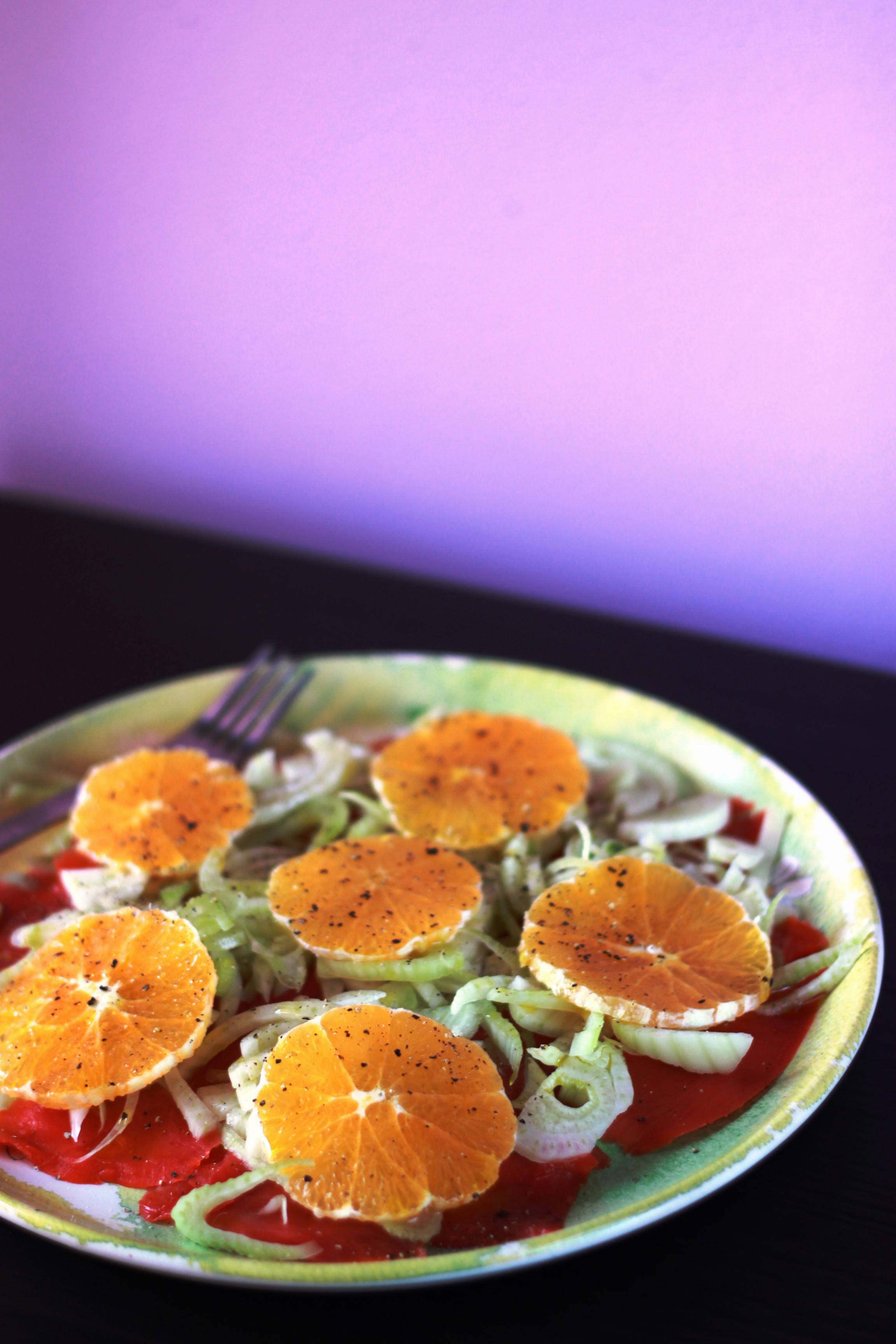 Disponete il salmone in un piatto, tagliate a listarelle finissime il finocchio e fate a fettine un arancio sbucciato. Disponete il tutto secondo il vostro estro del momento e condite con olio, un pizzico di sale, pepe nero o meglio ancora pepe rosa, e, se riuscite a trovarne, qualche fogliolina di aneto.