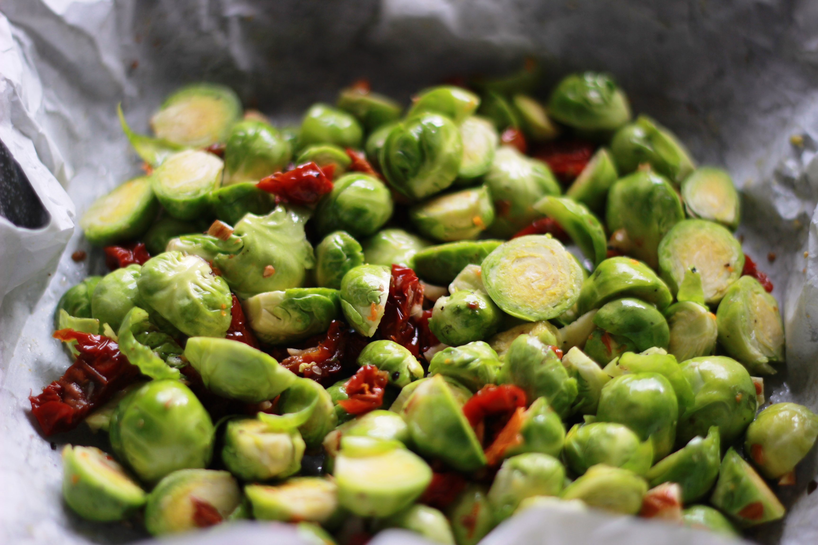 Cavoletti di Bruxelles con mandorle, arancio e pomodori secchi