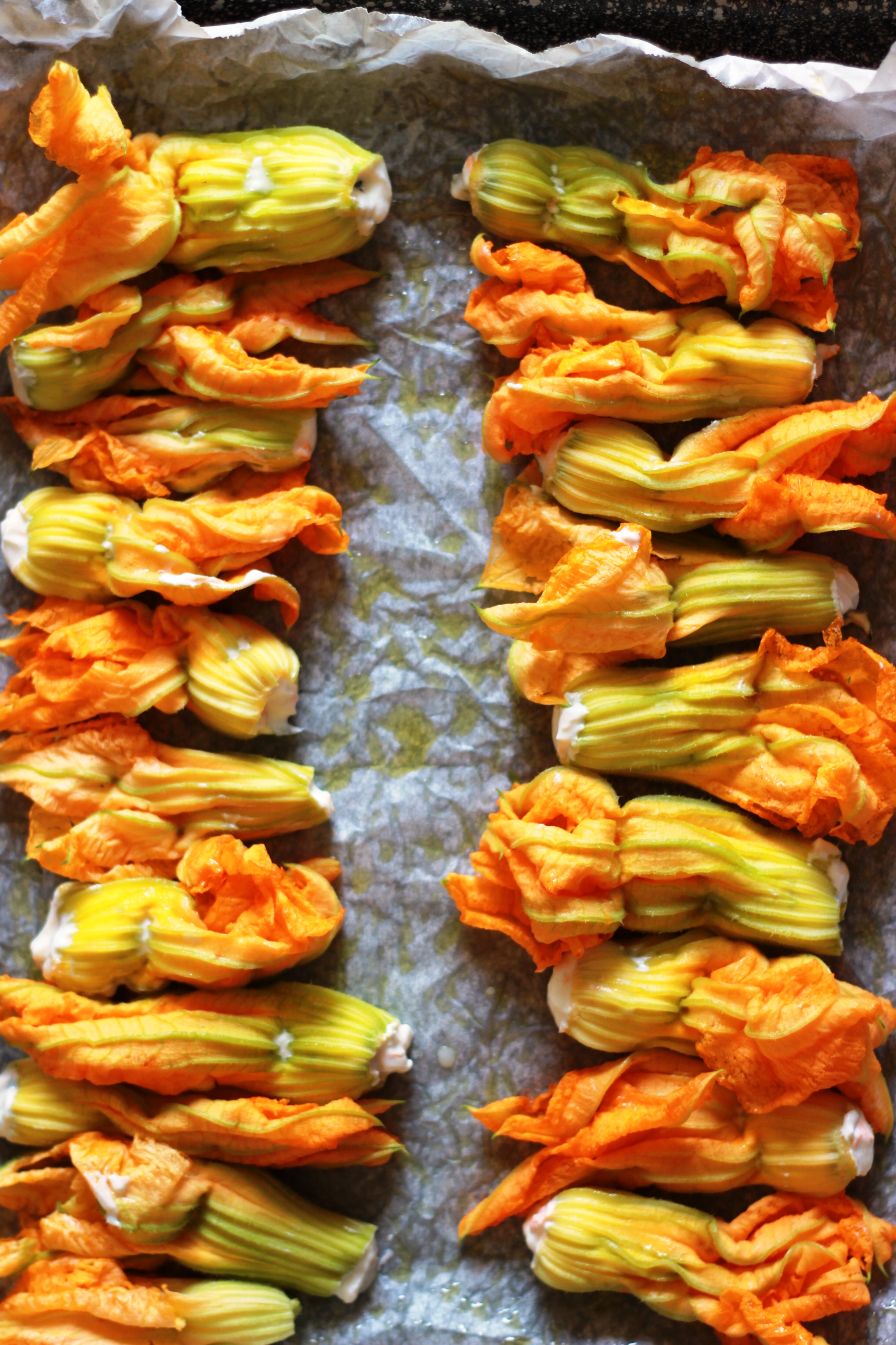Lavate e asciugate una ventina di fiori di zucca ancora chiusi. Tagliate la parte inferiore del fiore per eliminare il pistillo. Tritatene un paio che aggiungerete al ripieno. In una terrina, lavorate la ricotta con il sale, il pepe, l’olio, il parmigiano, i fiori spezzettati e la menta tritata finemente. Passate il composto in una sac a poche e riempite i fiori, adagiandoli poi su una teglia foderata con carta forno. Condite con un filo d’olio e sale e cuocete in forno a 180°C per circa 20 minuti.