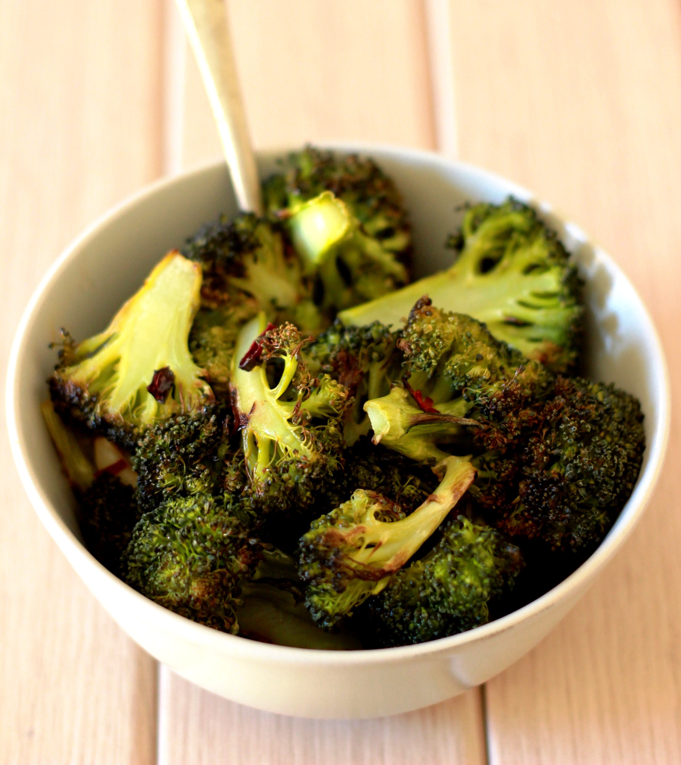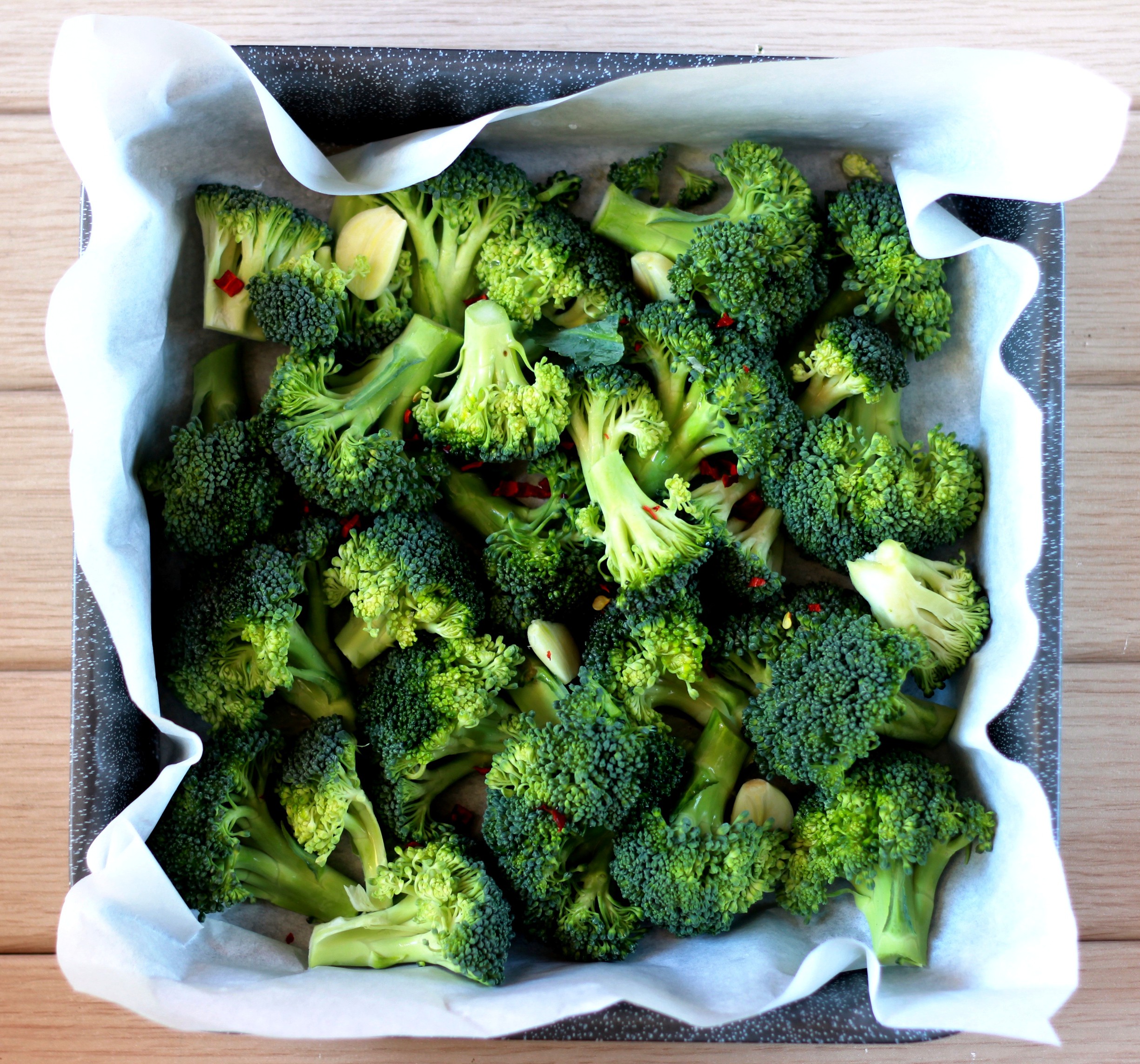 Lavate un broccolo e tagliate le cimette. Potete cuocere anche i gambi più grossi privandoli della parte esterna. Metteteli in una teglia rivestita di carta forno insieme a un generoso filo d’olio, due spicchi d’aglio, sale a piacere e peperoncino tagliato a listarelle. Mescolate tutto e cuocete in forno a 200°C per circa 10 minuti, quindi girate le verdure in teglia e continuate la cottura per 5-10 minuti fino al grado di arrostitura che preferite.