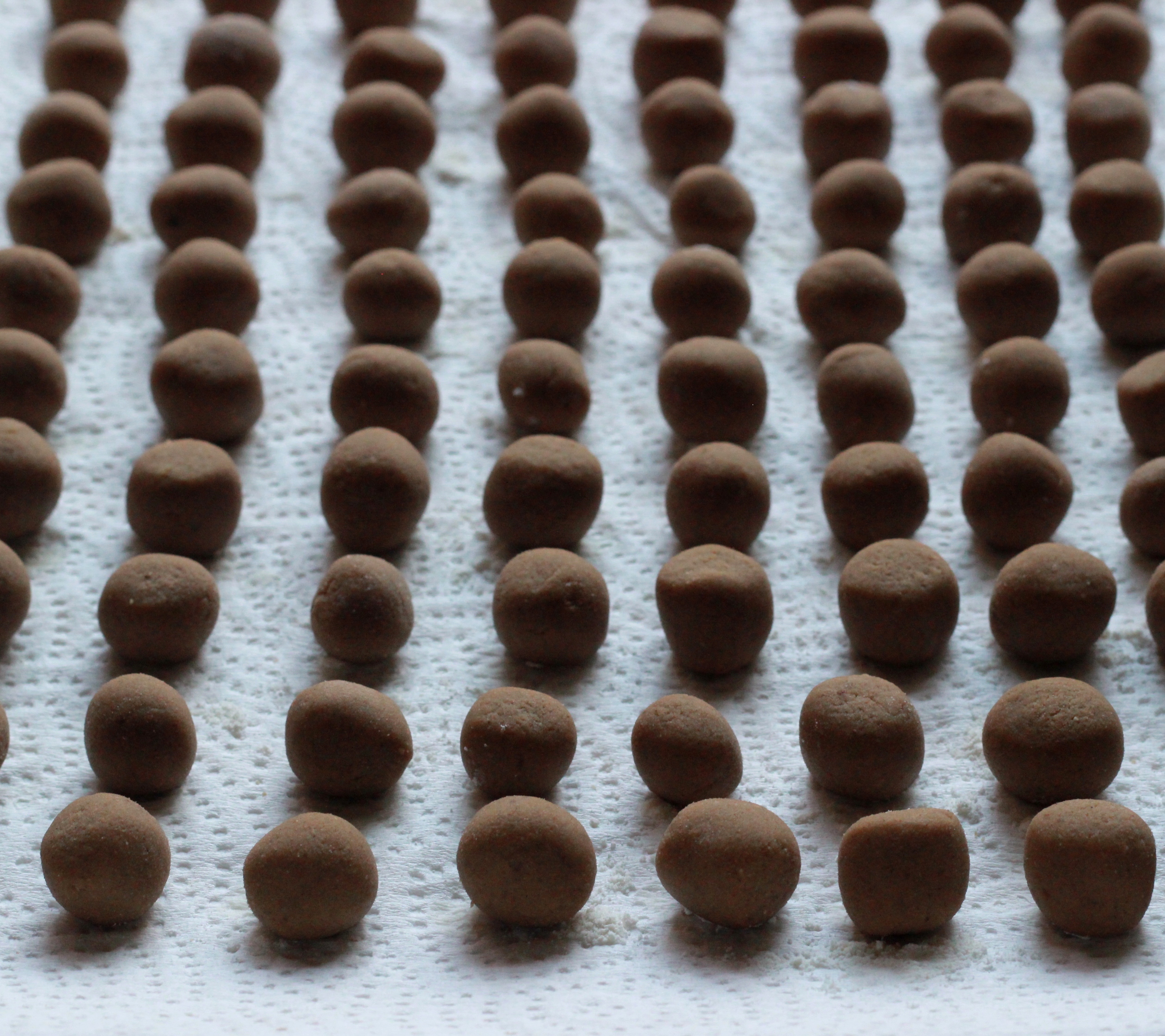 Lessate le patate in acqua salata, sbucciatele e passatele con lo schiacciapatate facendole cadere su un pianale di legno. Unite la farina di castagne e la fecola, i tuorli, un pizzico di sale, di pepe e uno di noce moscata e lavorate l’impasto per alcuni minuti, formando alla fine una palla. Staccate dei pezzetti di pasta e con le mani formate dei serpentelli di circa 1 cm di diametro, tagliateli a quadratini e con le mani infarinate formate delle palline.