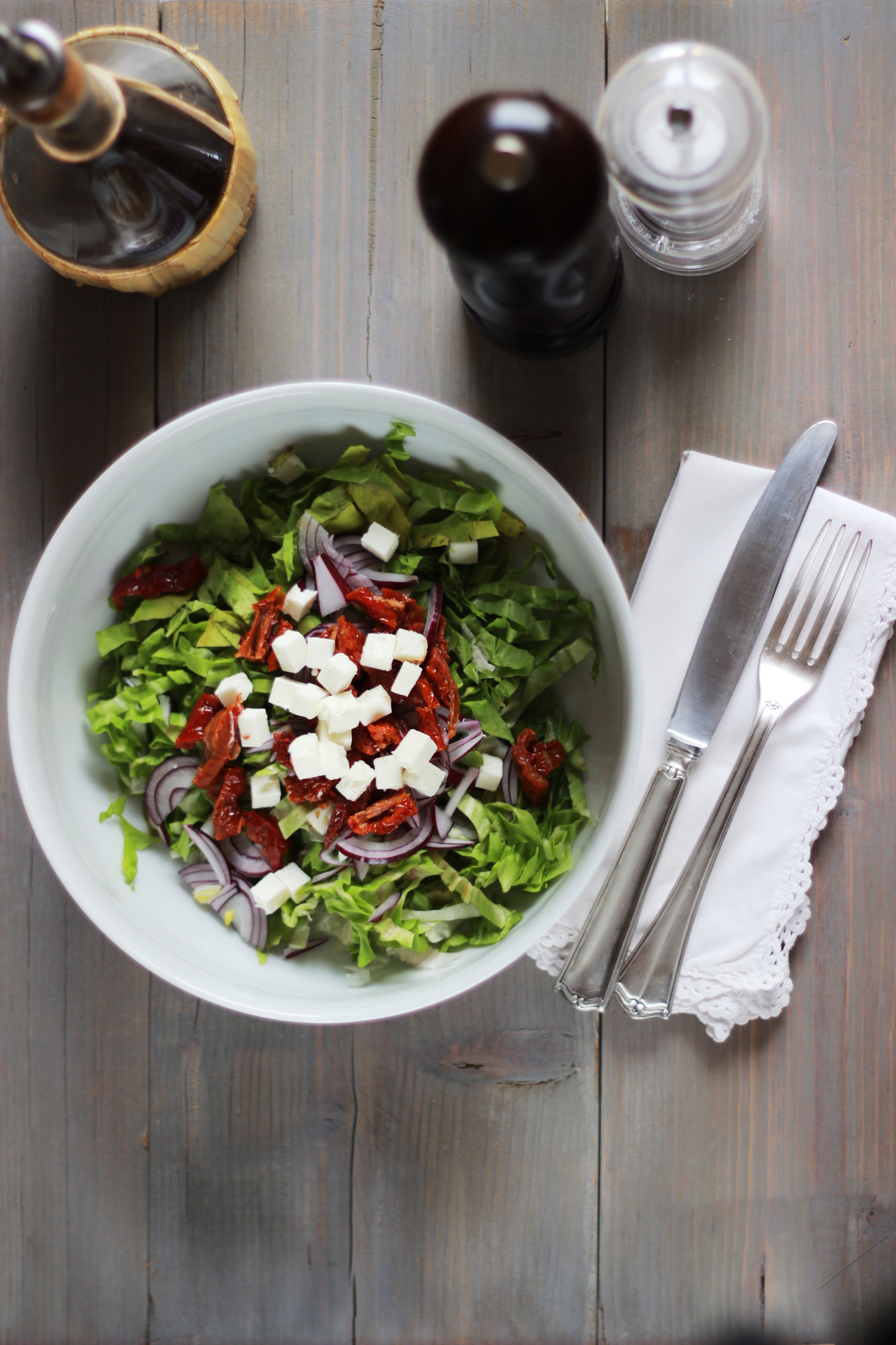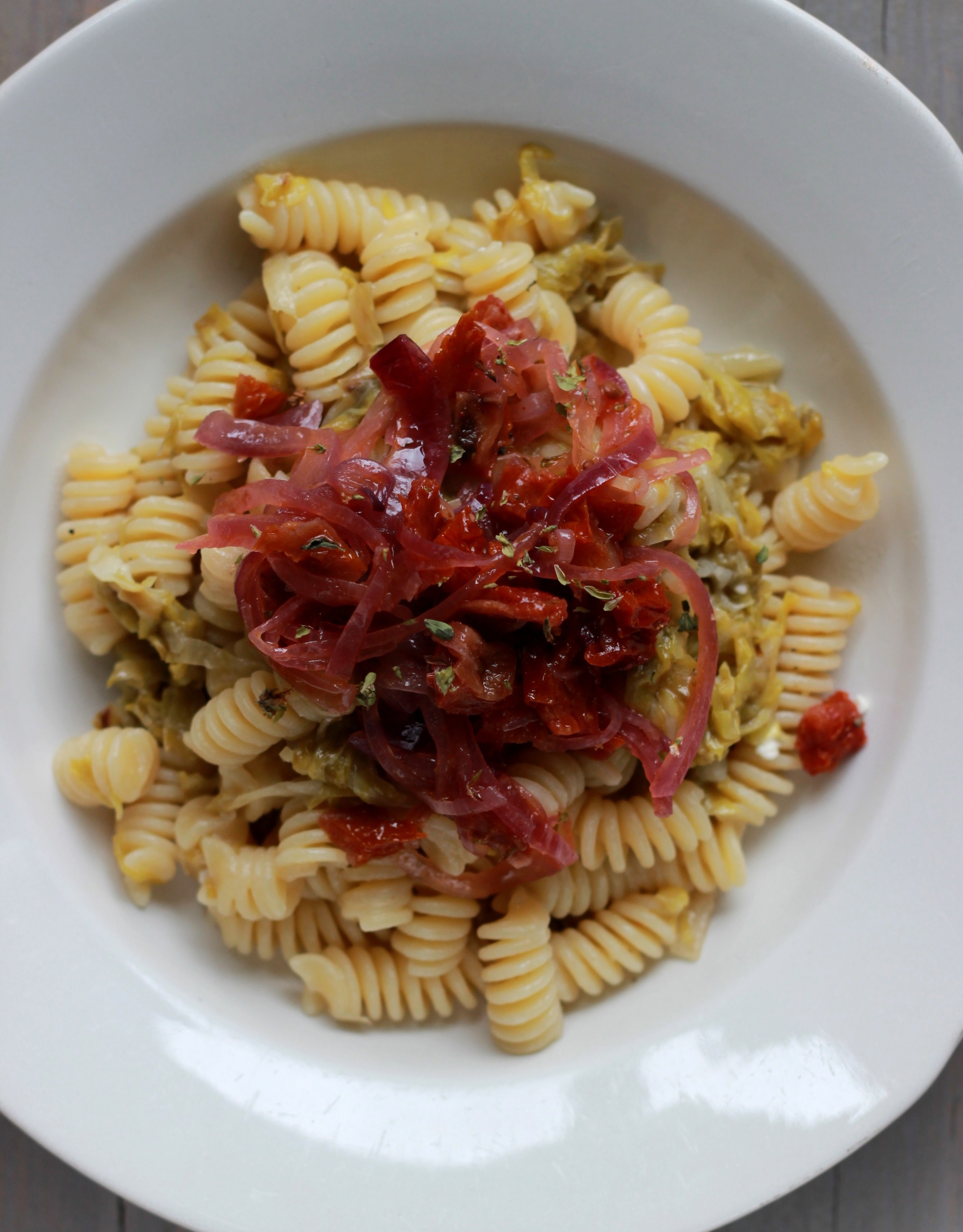 Questa ricetta nasce come un’ insalatona per palati forti e finisce per diventare un condimento gustosissimo per una pastasciutta. La storia in realtà attraversa quasi un anno, giusto il tempo che tornasse la stagione del radicchio variegato, perchè l’ insalata in effetti l’avevo preparata un anno fa. Sfortuna volle che, mentre ce la mangiavamo e intanto pensavo a quanto ci poteva venire buona una pasta, la stagione di questo radicchio particolare fosse finita, e quindi nulla, quest’insalata rivive oggi la sua seconda vita. Il radicchio variegato ha un sapore delicatissimo, con sentori di nocciola, ed è molto tenero. Ho aggiunto la cipolla cruda, che io adoro in insalata, con l’unico accorgimento di tenerla un po’ di tempo a bagno una volta tagliata… Non che elimini completamente l’ effetto poco conciliante della cipolla in quanto a socializzare, ma come vi dicevo è un’insalata per palati poco raffinati! Se proprio volete ometterla, rimarranno comunque la feta greca, l’ ellenico formaggio fresco di capra, e i pomodorini secchi a dare un gusto deciso alla vostra insalata.