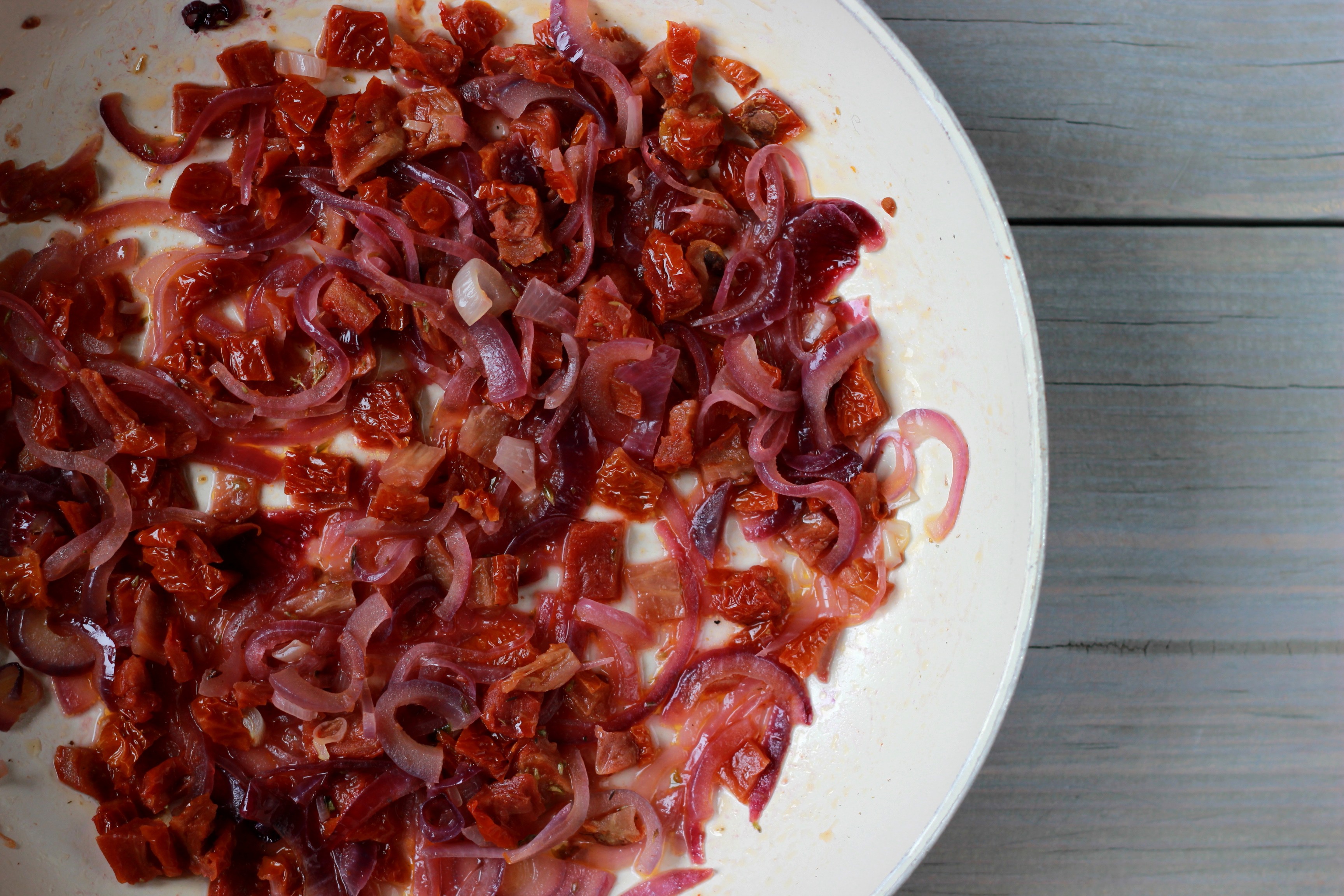 Tagliate finemente la cipolla a fettine e i pomodorini secchi a dadini e metteteli a stufare con un filo d’olio, poca acqua, un pizzico di sale e uno di origano per circa 10 minuti.