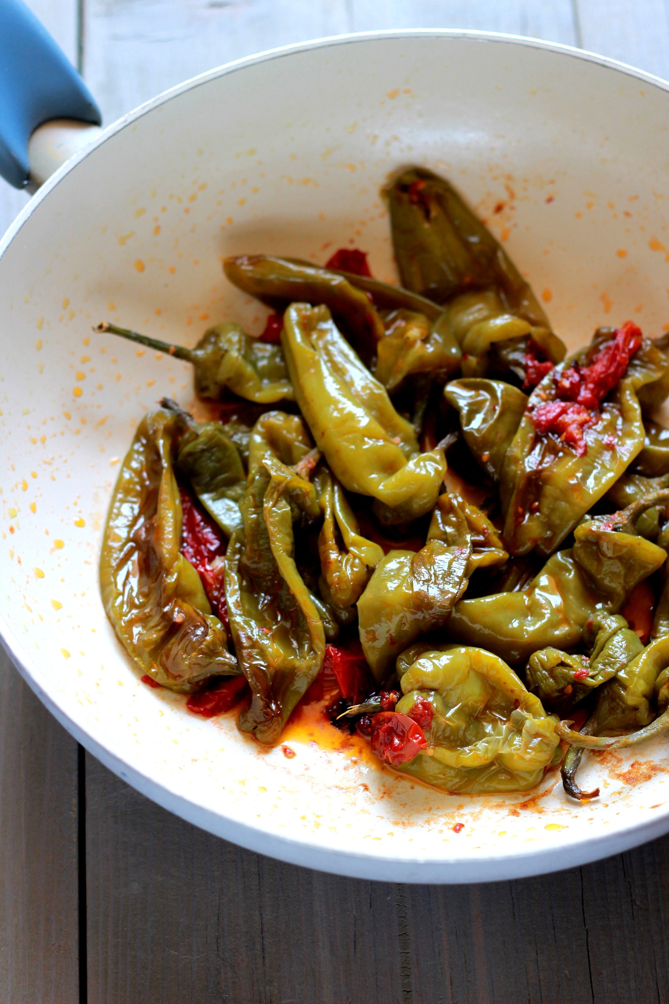 Camminando per le vie di un bianco paese del Sud potrebbe capitarvi di incontrare il profumo della ricetta che vi propongo oggi. Dei peperoni friggitelli sfrigolano vivacemente in una pentola, accompagnati da dolci e succosi pomodorini datterino. Il profumo si diffonde da una finestra poco lontano lungo un tratto di strada. È quasi ora di pranzo, la calura estiva ancora non demorde in un’ assolata giornata di metà Settembre, noi appiccicati e affamati annusiamo l’aria e ci massaggiamo la pancia, immaginandoci quanto sarebbe bello essere ospiti di quel godurioso pranzo.