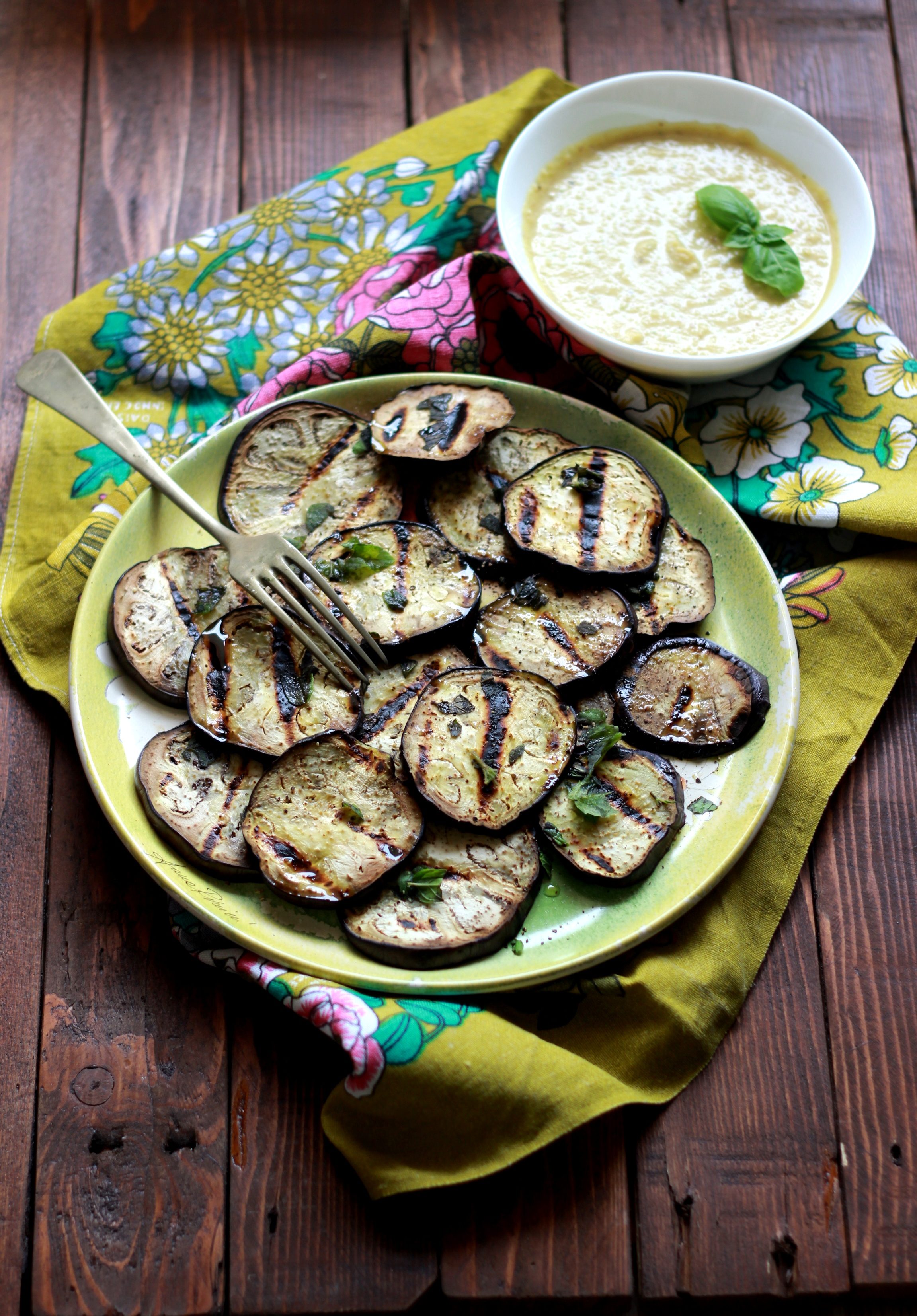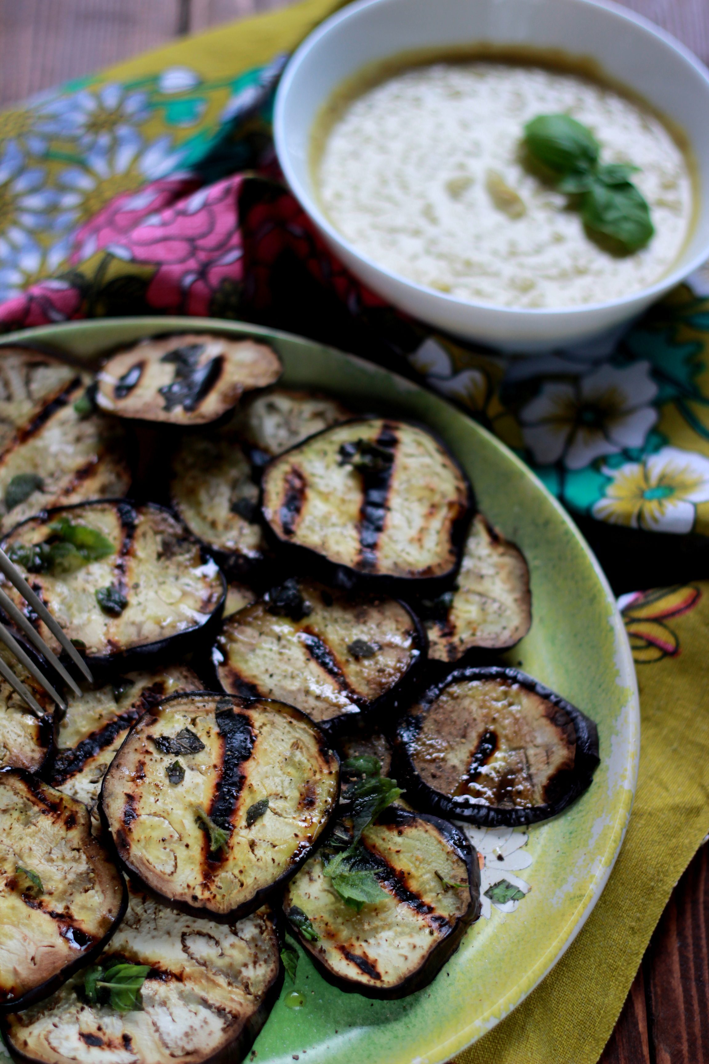 Melanzane grigliate alla menta con crema di ceci al basilico