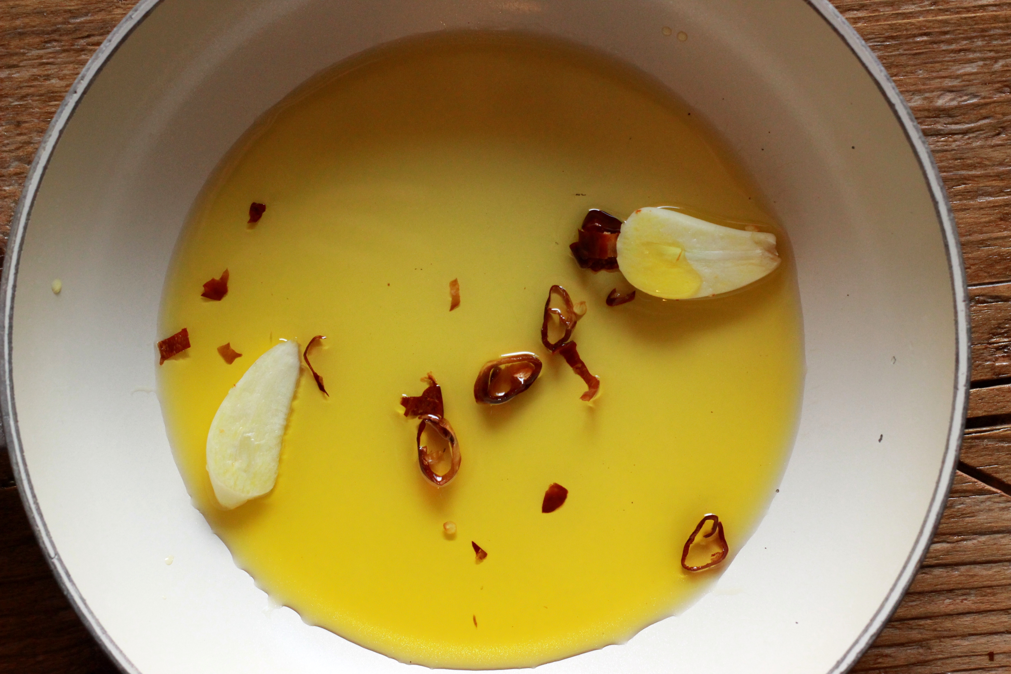 - In un padellino mettete 5 cucchiai di olio, uno spicchio d’aglio diviso a metà e un peperoncino tagliato a listarelle. Per il peperoncino regolatevi secondo l’intensità, si deve sentire ma non deve essere piccantissimo!