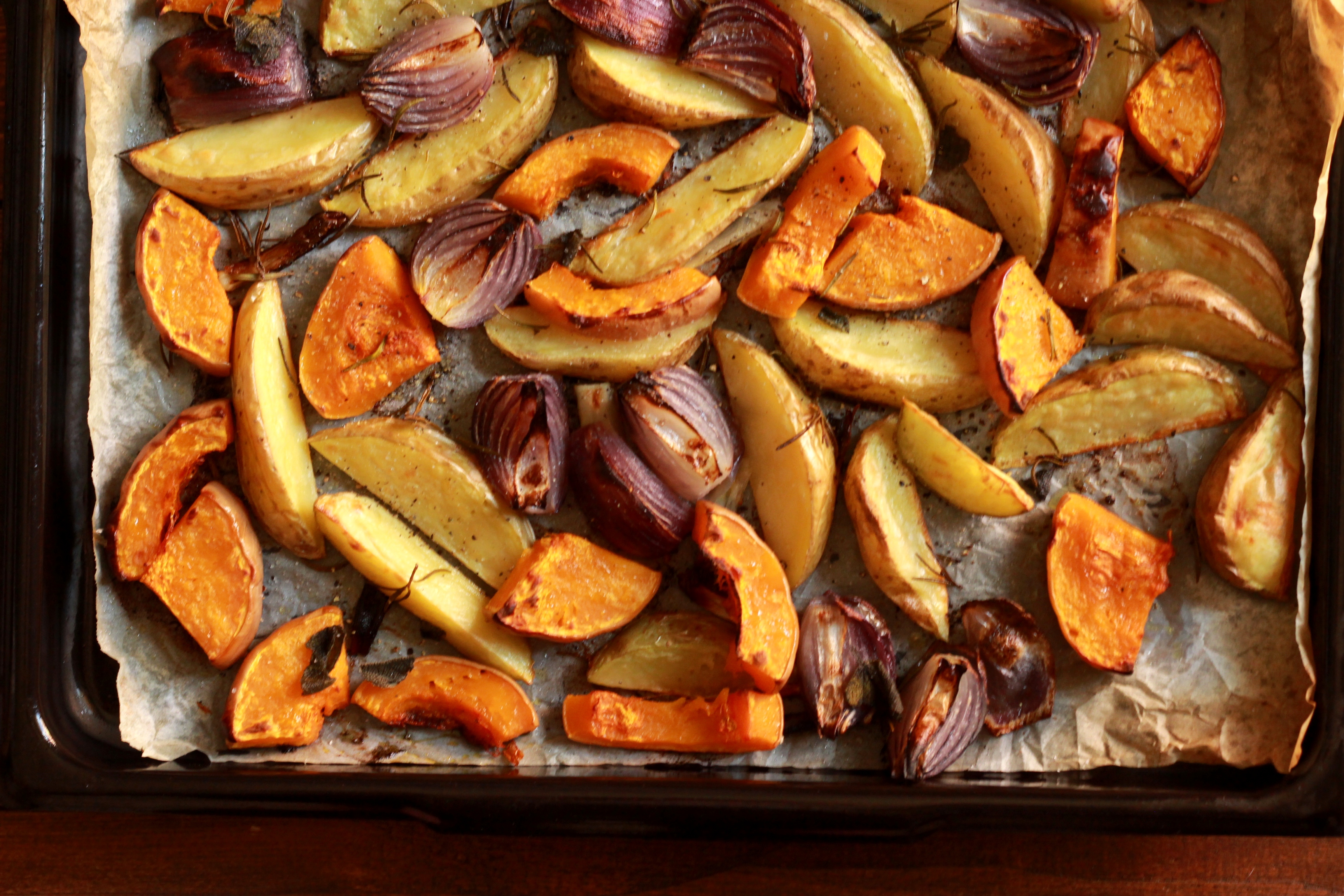 - Mettete le verdure in una teglia rivestita di carta forno e mescolatele con olio, salvia e rosmarino.