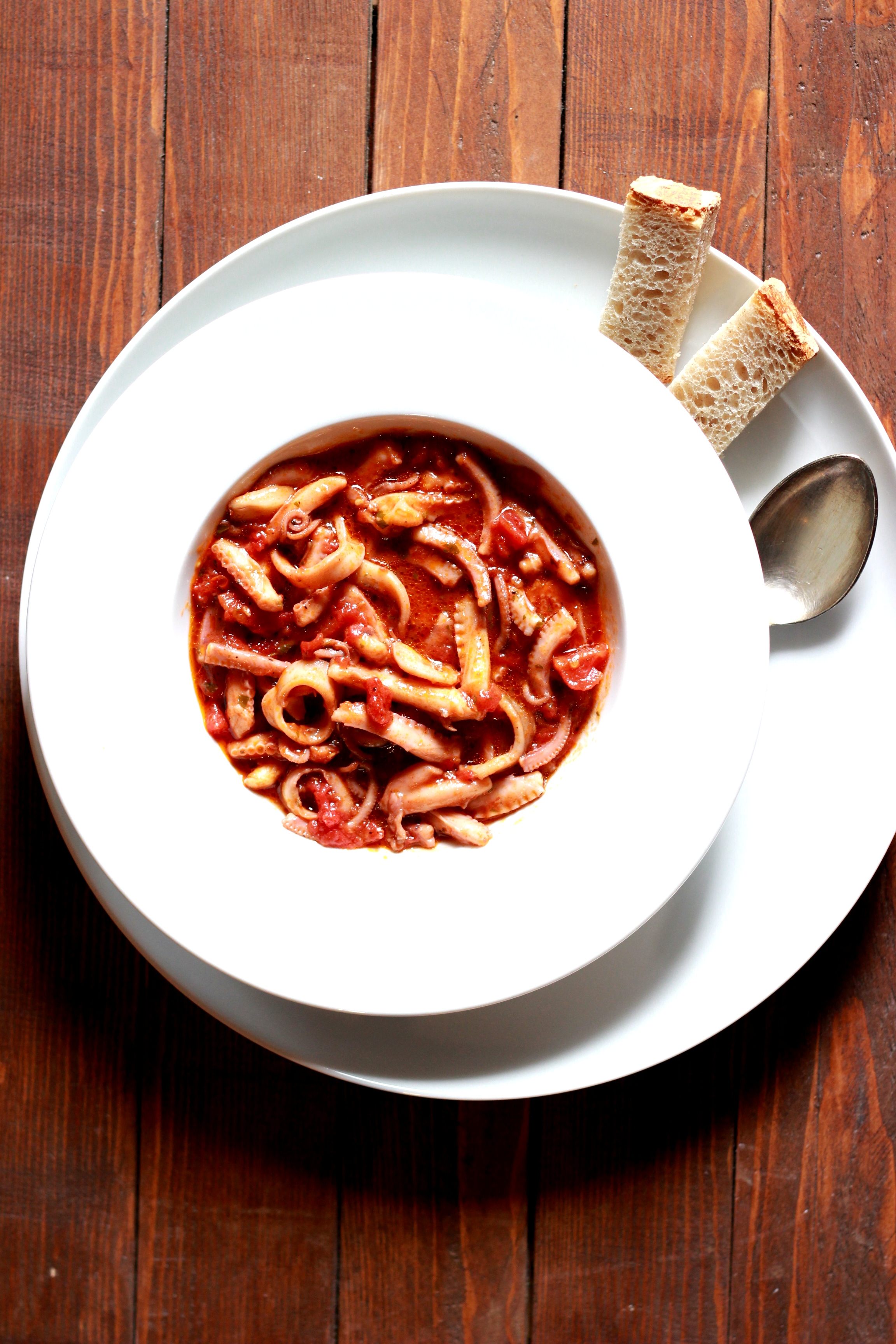 - Aggiungete i pomodori pelati tagliati a pezzi. I moscardini devono essere avvolti dal pomodoro ma non affogati!
